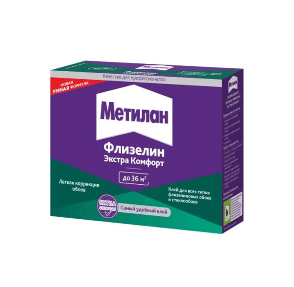 Клей Метилан Флизелин Экстра Комфорт предназначен для флизелиновых обоев. Его главным преимуществом является новая умная формула для более комфортного процесса поклейки обоев. Клей легко развести, комки не появятся даже при добавлении воды в клей (при интенсивном перемешивании). Продукт обладает высокой начальной силой схватывания, а при неровном наклеивании обоев в течение 15 минут их можно легко корректировать.