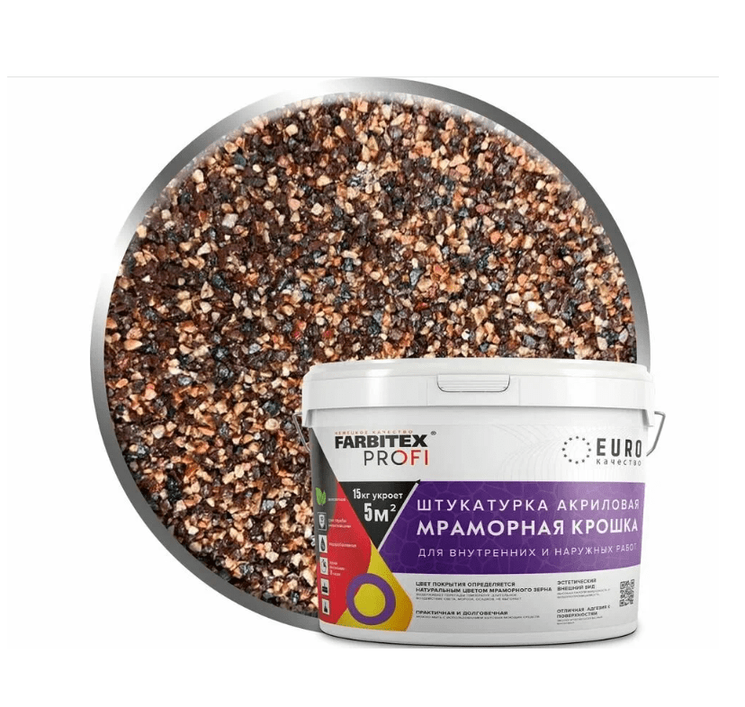 Акриловая штукатурка Farbitex (мраморная крошка; крупнозернистая; 1,5-2 мм; шоколадная крошка) предназначена для декоративной отделки стен, потолков, архитектурных деталей и других элементов интерьера, а также для декорирования стен в местах общественного назначения (торговые центры, рестораны, клубы, кинотеатры и др.). При нанесении и растирке кельмой (теркой) образует характерное фактурное покрытие, напоминающее необработанный мрамор. При нанесении и растирке кельмой (теркой) образует характерное фактурное покрытие, напоминающее необработанный мрамор. Штукатурка представляет собой вязкую однородную массу с мелкозернистым или крупнозернистым наполнителем из натуральной мраморной крошки. Образует однотонное или многоцветное светостойкое влагостойкое покрытие. Материал обладает высокой адгезией к минеральным поверхностям. Экологически безопасная. Водоразбавляемая. Не содержит органических растворителей. Поверхность должна быть сухой, очищенной от жировых загрязнений, не должна крошиться и осыпаться. Остатки старых клеевых и дисперсионных красок необходимо удалить. Сильно впитывающие основания рекомендуется предварительно обработать грунтовкой адгезионной. Расход в зависимости от размера фракции: 0,5-1мм средний расход 2,5-3 кг/кв.м , 1,5-2мм средний расход 3-4кг/кв.м. Время высыхания “от пыли” составляет 8 часов. Окончательное отверждение через 72 часа.