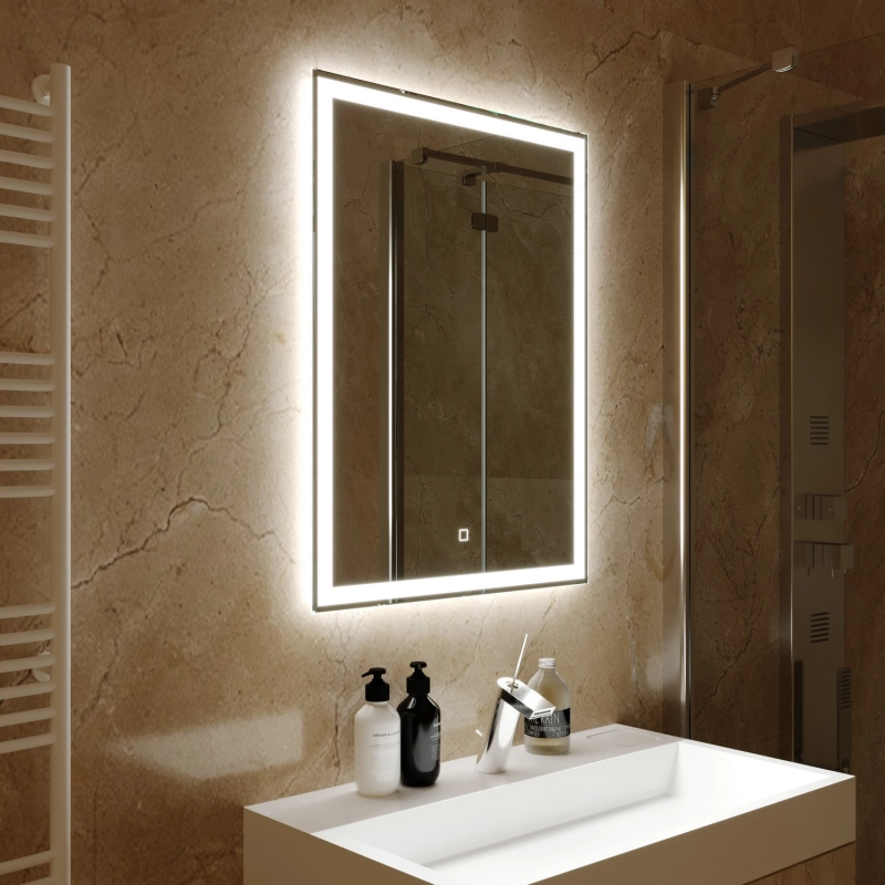 Зеркало MIXLINE “Норма-Лайт” ШВ оснащено сенсорным выключателем с функцией диммера, что позволяет регулировать освещение от более яркого к более приглушенному. Изготовлено из влагостойкого зеркального полотна толщиной 4 мм, которое гарантирует четкое отражение и отсутствие искажений. В качестве элемента подсветки используется светодиодная лента. Свет – белый (холодный 5800-6300К). Срок службы диодов – 100 000 часов.