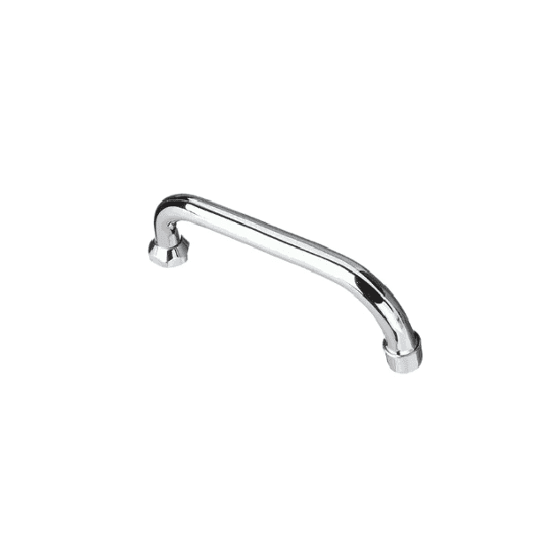 Излив верхний для настенных смесителей П-образный с аэратором имеет диаметр 18мм, длина излива – 20см. Излив изготовлен из нержавеющей стали. Толщина излива 0,5мм. Аэратор пластиковый с решеткой из нержавеющей стали. Гайка силуминовая, размер 3/4″.